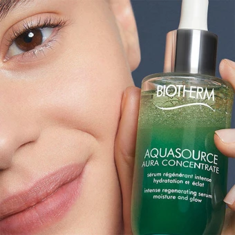 Das Aquasource-Serum von Biotherm enthält den legendären Inhaltsstoff Aura Leaf, der die Haut optimal mit Feuchtigkeit versorgt und ihr einen natürlichen Glow schenkt. Die exklusive Zweifach-Textur verschmilzt bei Kontakt mit der Haut augenblicklich und zieht schnell ein.