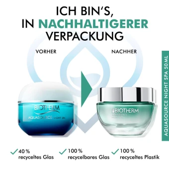 Biotherm’s erste Nachtpflege mit 3-fach Spa Effekt für aufgefüllte Feuchtigkeitsspeicher und intensive Feuchtigkeitsversorgung über Nacht. Entdecken Sie den ultimativen Spa-Effekt, um die Feuchtigkeitsspeicher der Haut im Schlaf aufzufüllen. Die legendäre Aquasource Formel gibt es jetzt in einer super reichhaltigen Maske, die auf der Haut bleibt. Wachen Sie mit einer Haut auf, die mit Feuchtigkeit versorgt, geglättet und beruhigt ist. Nacht für Nacht wird die Haut verwandelt: Trockenheitsfältchen werden gemildert, der Teint wirkt frischer, die Haut ist mit Feuchtigkeit aufgepolstert.